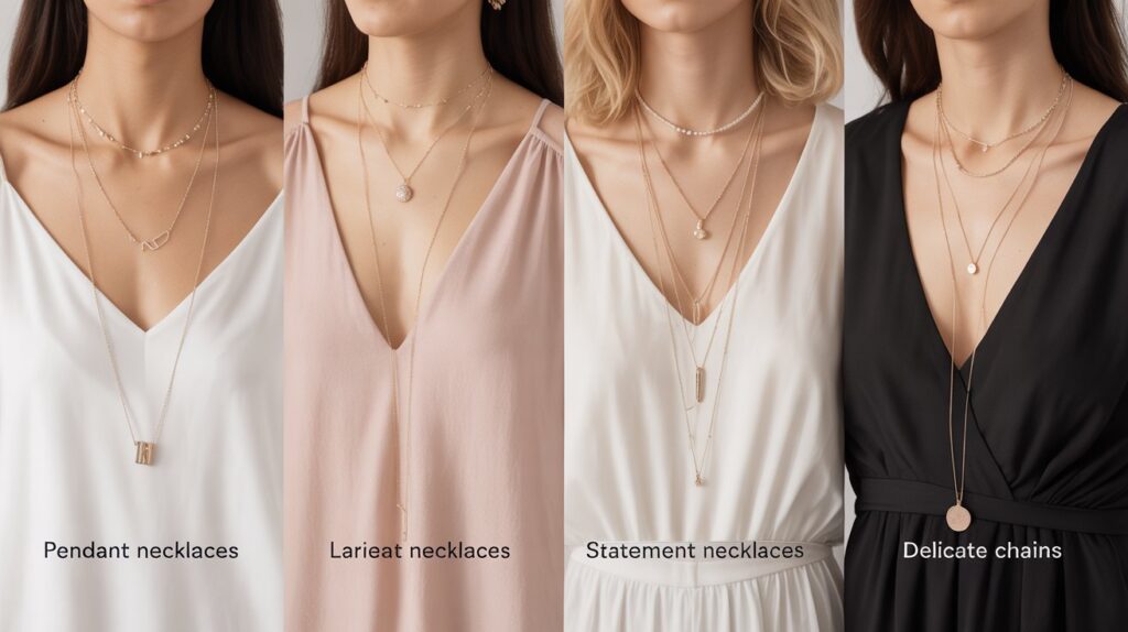 Pendant necklaces are one of the most popular and versatile choices for V-neck dresses. A single drop pendant follows the V shape perfectly, drawing attention downward and creating a slimming effect. Simple pendants work well for casual and workwear, while gemstone or diamond pendants are ideal for formal occasions.