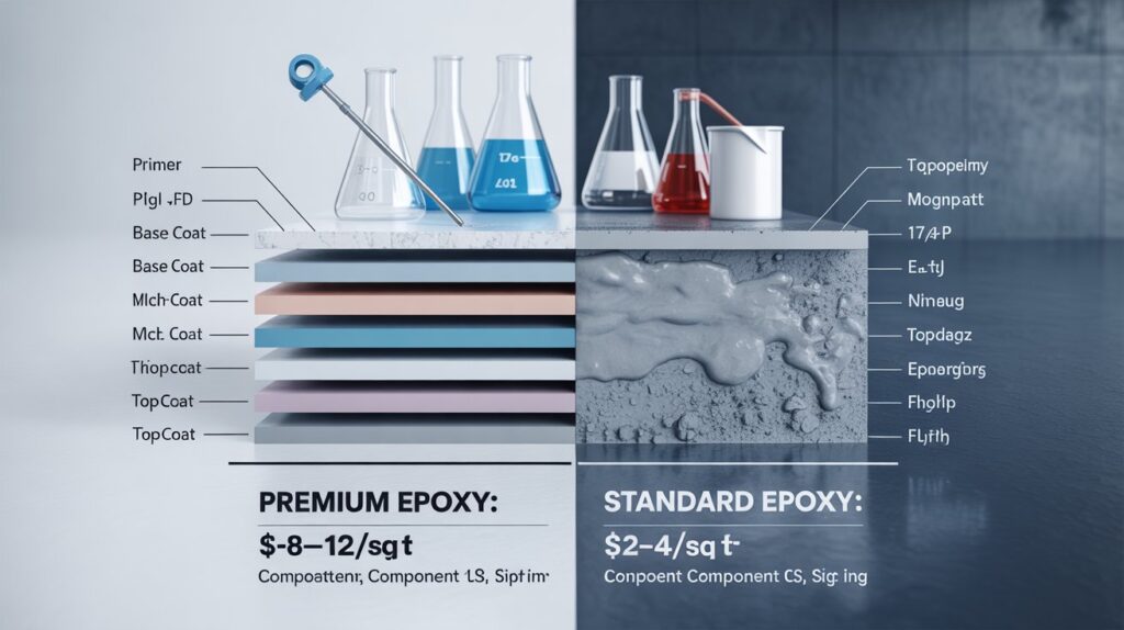 Decorative flakes, metallic finishes, anti-slip additives, or UV-resistant topcoats improve durability and aesthetics but increase overall cost. Each optional layer adds material and labour expenses.