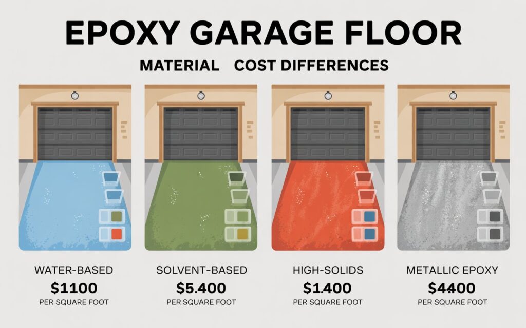 The cost of epoxy garage floor depends heavily on the type of epoxy material you choose. Each material has its own price range, durability level, and appearance. Understanding these differences will help you select the right option for your garage and budget.