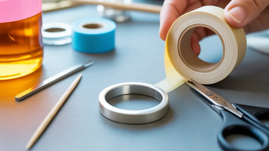 Regular household tape often does not stick well to metal or silicone and can leave sticky residue. Crafting tapes are designed to prevent leaks and peel off cleanly after resin cures.