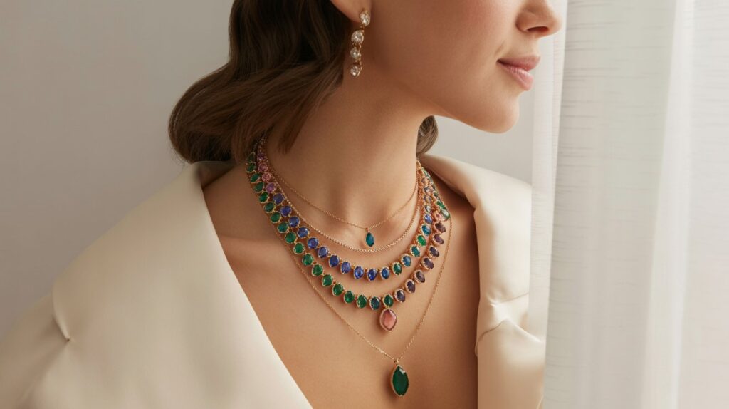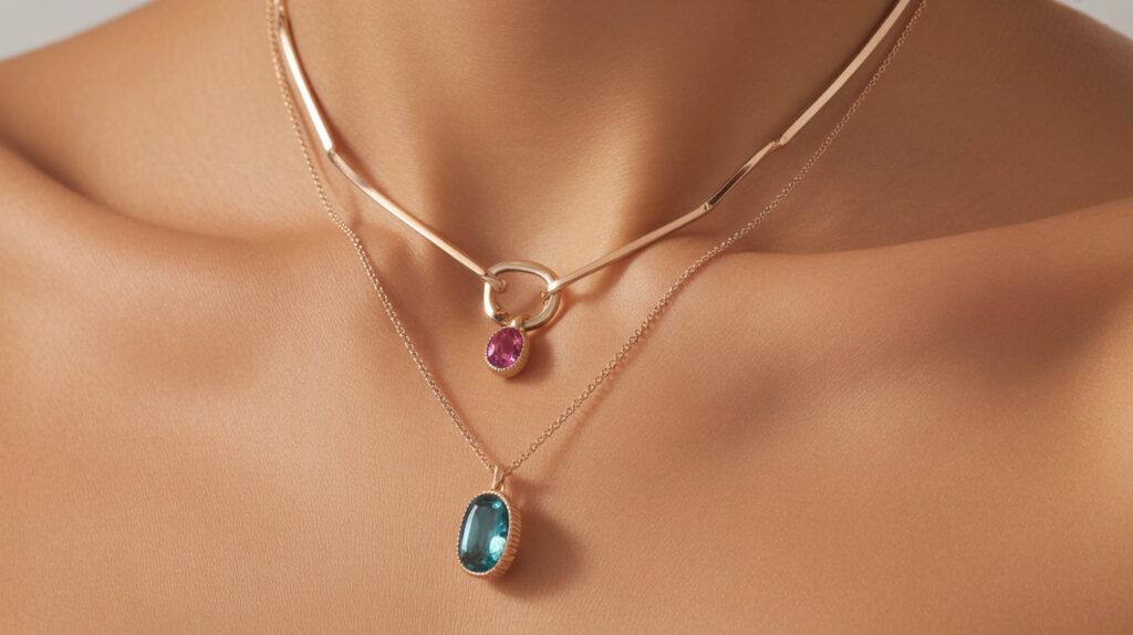 Storing your necklaces properly also helps extend their lifespan. Keeping them in individual pouches or a jewelry box prevents scratches and tangling, especially for delicate chains or layered pieces. Regularly wiping the metal and stones with a soft cloth removes oils and dust, keeping the necklace vibrant and polished.