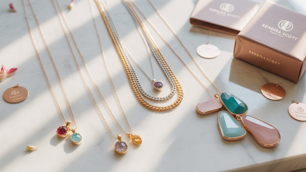 One of the most popular design categories is the pendant necklace, especially Kendra Scott’s iconic stone shapes. These pieces add a soft, feminine touch while keeping your look simple and stylish. If you like layering necklaces, you’ll also find many dainty chains and chokers that are perfect for mixing and matching. Another popular style includes statement necklaces, which feature larger stones and unique shapes for people who love eye-catching fashion accessories.