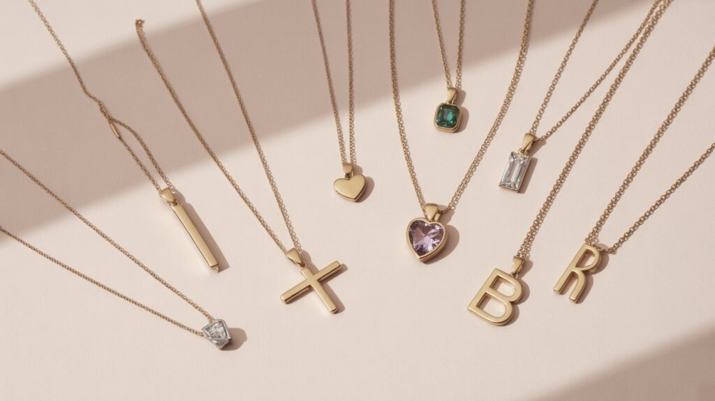 Popular styles include minimalist bars, initial pendants, heart charms, gemstone pendants, lockets, geometric shapes, layered necklaces, statement designs, pearls, and chains with mixed materials.